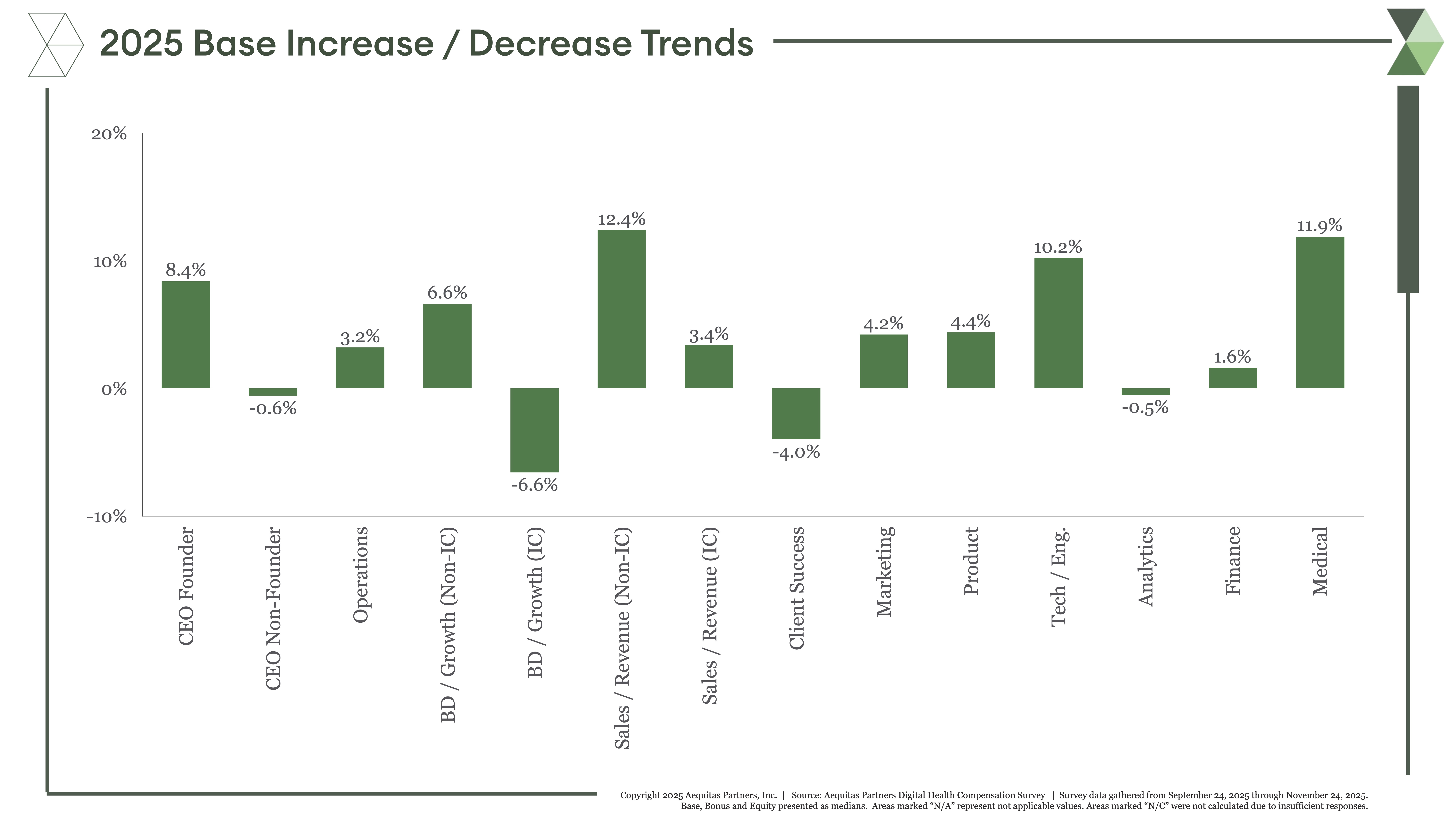 While the rise in compensation is modest on average, with only three areas seeing a down-tick, key functions are seeing outsized growth in comp, demonstrating higher demand and more competition. Founding CEOs are finally getting their base compensation marked closer to market with 8.4% growth. C-level Growth and Revenue leaders are driving their guaranteed comp higher as topgrading within the function continues year over year, with 6.6% and 12.4% increases, respectively. And the tremendous amount of funding for AI companies has heightened the demand for Technology leaders, with a 10.2% increase in base.