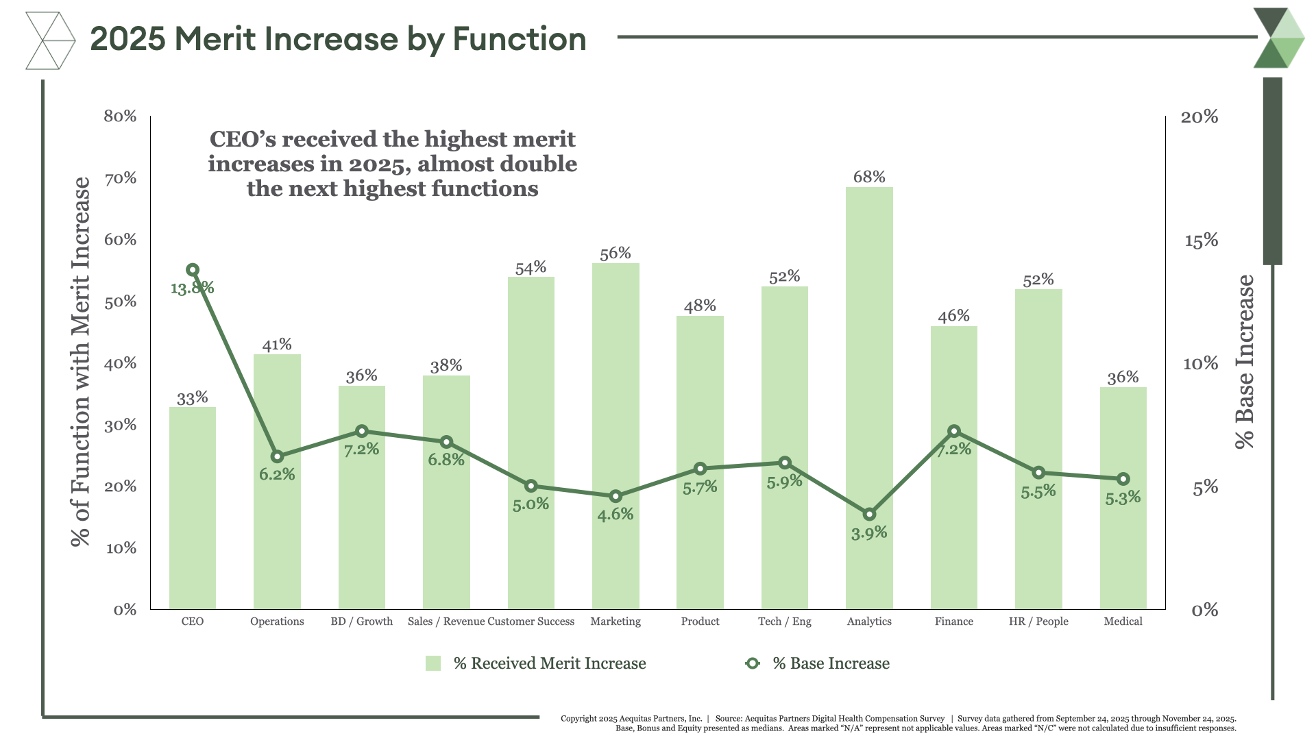 New year, new merits (and merit increases 😉). In 2025, 43% of executives we polled in our annual Compensation Study received a merit increase of 6.9%. This is slightly down from 7.2% from the year before. The biggest winners were CEOs with an increase 14%, though only 33% received one. Completely flipped were Analytics execs, 68% of whom received an increase but only of 3.9%.